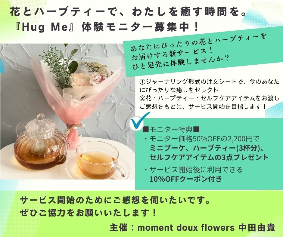 「花とハーブティーのサブスクBOX『Hug Me』」を、ひと足先に体験していただけるモニターを募集します。